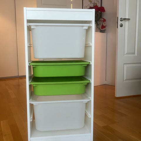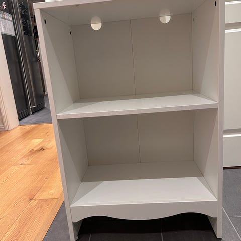 IKEA Bergig bokställ med förvaring i vitt. Bokstället har flera hyllplan för böcker och en låda för förvaring. Passar för barnrum eller andra utrymmen där förvaring av böcker och småsaker behövs.