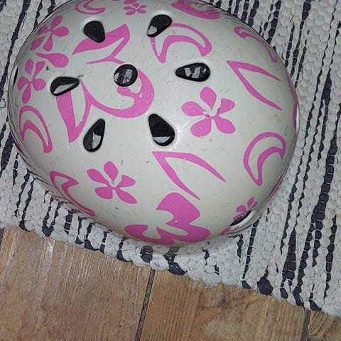 Extreme hjälmen är vit med rosa blom- och fjärilsmönster. Strl L/XL