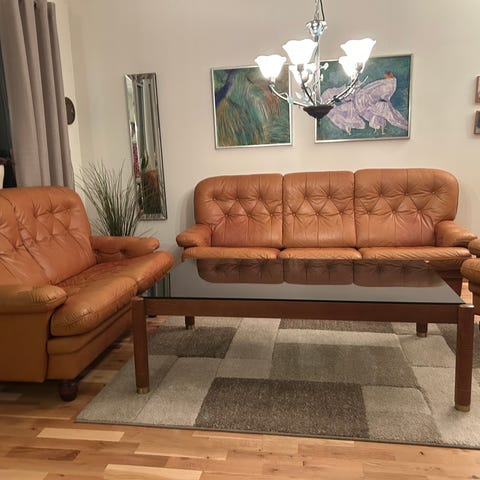 3 sitssoffa 185 cm+2 fåtöljer 90 cm + glasbord 144x83 cm