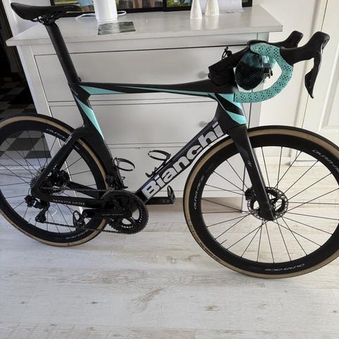 Bianchi Aria Sram Red med dubbelsidig effektmätning. Kört en Vätternrunda på den och fungerade alldeles perfekt. I väldigt fint skick, alltid stående inomhus och enbart solskens cykling.
