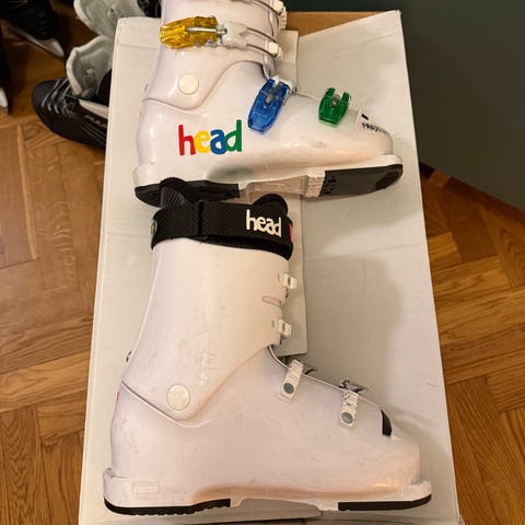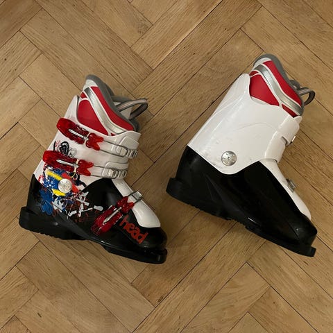 Jag säljer ett par Head Raptor Caddy junior alpinskidpjäxor i svart och vitt med röda och blå detaljer.