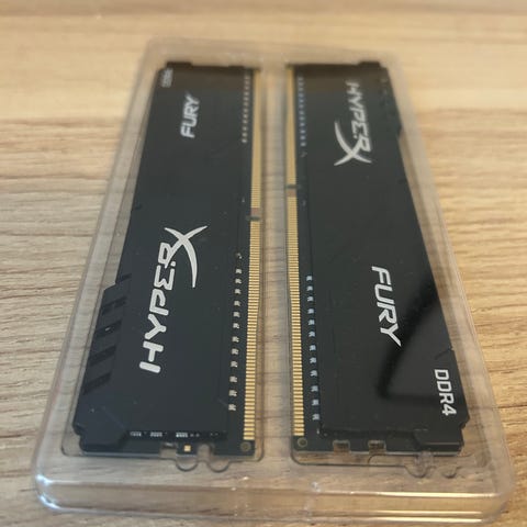 HyperX Fury RAM-minne DDR4-moduler. Två stycken minnesmoduler med svart kylfläns och designad för stationära datorer.