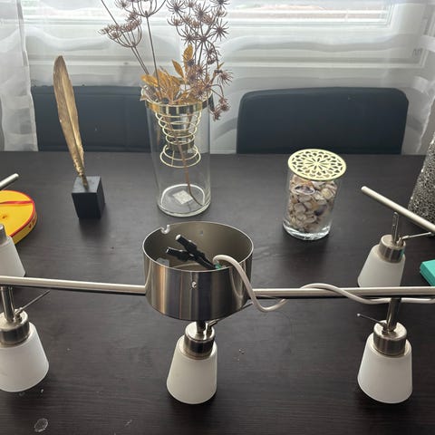 Taklampa med fem ljuskällor, tillverkad i metall och glas. Lampan är designad för att hängas i taket och har en klassisk stil med vita lampskärmar i glas. Kan levereras i Stockholms område Skogås,Älvsjö.