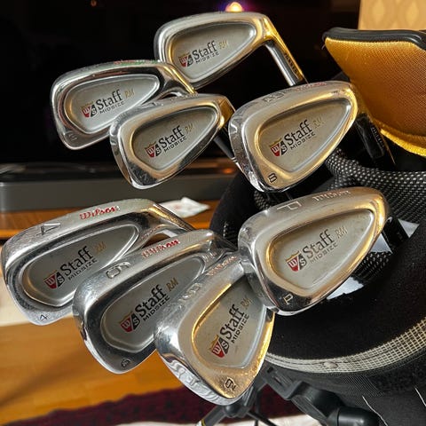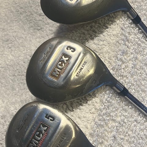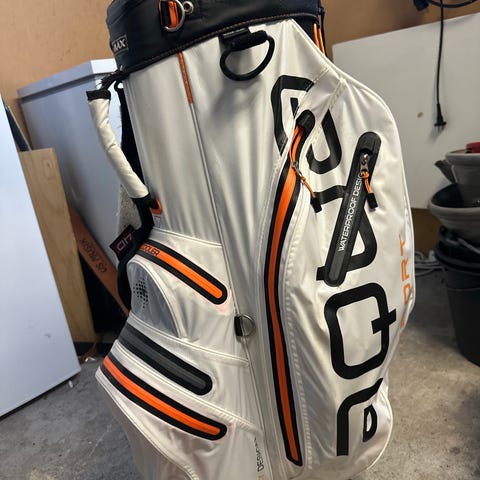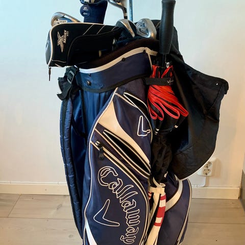 En driver, 2 fairway woods, 7 järnklubbor (5, 6, 7, 8, 9, S, W) och putter. Svart vagnsväska med flera fickor och bärrem samt vagn. Skickas inte hämtas i Holmsund.
