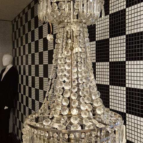 Mycket fin kristallkrona med runda prismor. Höjd från tak inklusive kedja 76 cm.