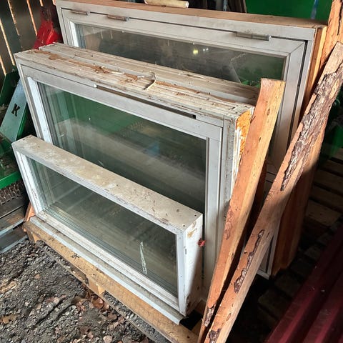 9 stycken fasta fönster, brunt trä insida och vit aluminium utsida.