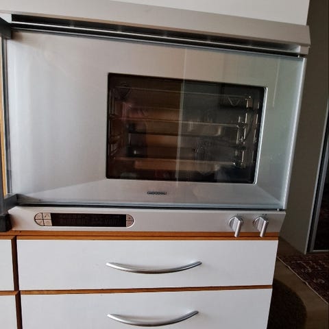 varmluftsugn i rostfritt stål. Ugn med varmluftsfunktion, lämplig för professionell eller hemmabruk. Har glaslucka och kontrollpanel med vred för inställningar.