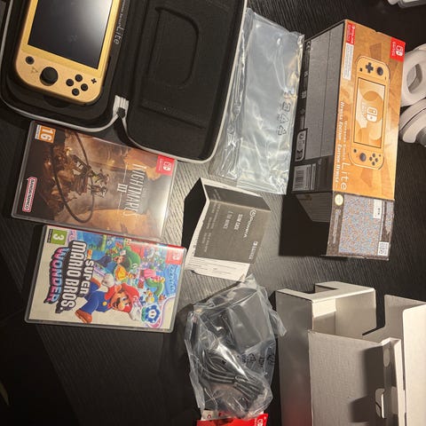 Nintendo Switch Lite Hyrule Edition är en bärbar spelkonsol i guld och beige färg. Den är designad för att spela Nintendo Switch-spel i en kompakt och lätt formfaktor.