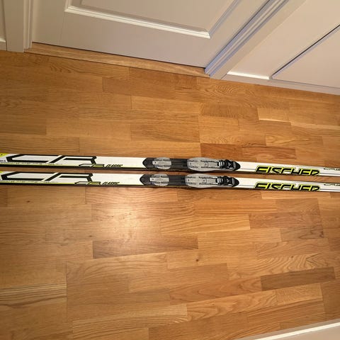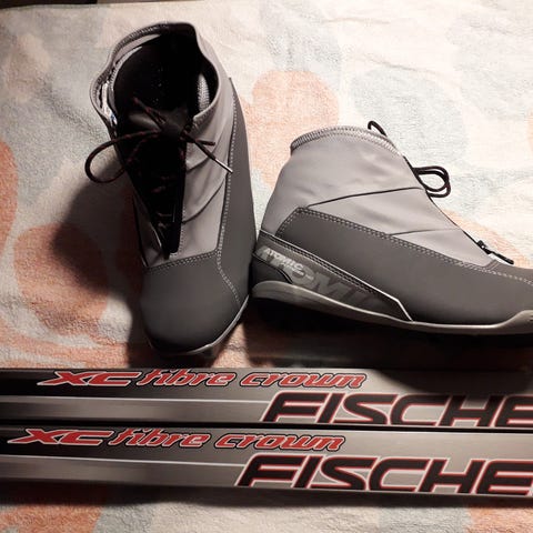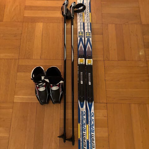 Set med längdskidor 90 cm, pjäxor strl 25 (ca 160mm) och stavar