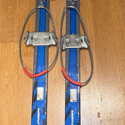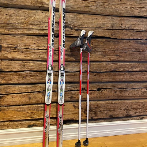 Skidor från Madshus 90cm, vallningsfria. Pjäxor från Madshus i storlek 25 (knappt 160mm) och stavar.