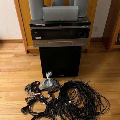 högtalarsystem inklusive två golvhögtalare, två bokhyllehögtalare, en subwoofer samt en förstärkare. Högtalarna har svart front och träfärgad ram. Systemet är avsett för ljuduppspelning i hemmiljö.