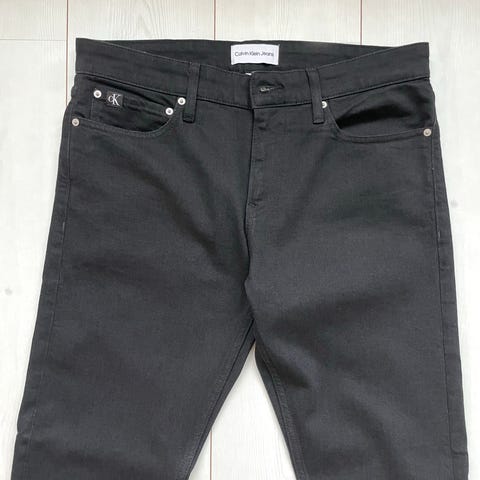 Calvin Klein Jeans Slim Taper denimbyxa i stålblå, lite grå, färg beroende på ljus. Se bilderna. Storlek W32 L32. Tillverkad i denimmaterial.