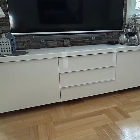 Stilren och stabil IKEA BESTÅ tv-bänk i vit högglans.