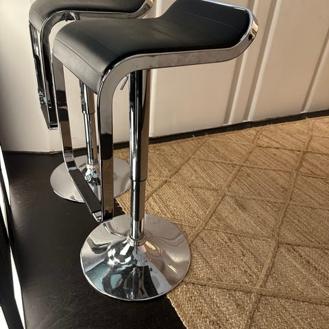 Fyra barstolar i svart och krom. Stapelbara och väldigt lite använda. 66 cm i sitthöjd.