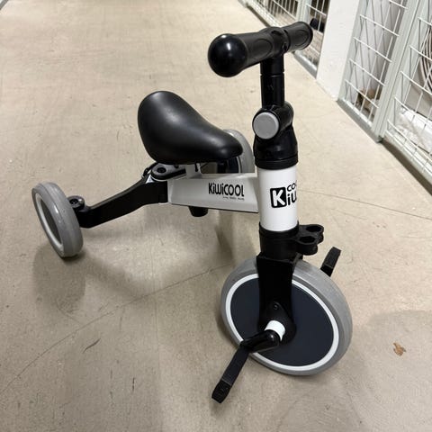 Balanscykel med ram i rosa färg och bruna handtag samt sadel. Passar barn och är avsedd för utomhusbruk.