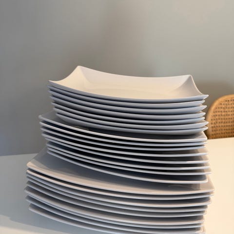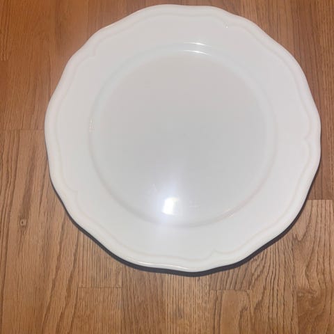 IKEA tallrikar och skålar i vitt med blå kant. Setet innehåller flera tallrikar och skålar i olika storlekar, lämpliga för vardagligt bruk i köket. Tillverkade av keramik eller porslin, material inte specificerat. Färgerna är vita med blå detaljer.