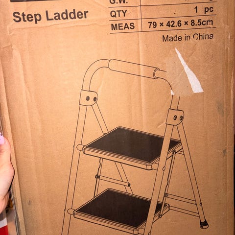 Trappstege med två steg i röd färg. Stegen har en metallram och plaststeg med mönster för bättre grepp. Passar för inomhusbruk vid behov av att nå högre höjder. , enligt på bilder finns i Västerås .