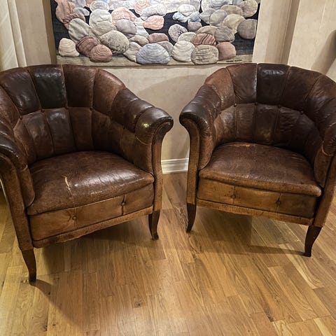 Helt underbar fåtölj i mossgrönt läder i väldigt fint skick. Skyddsöverdrag och läderolja skickas med på köpet.