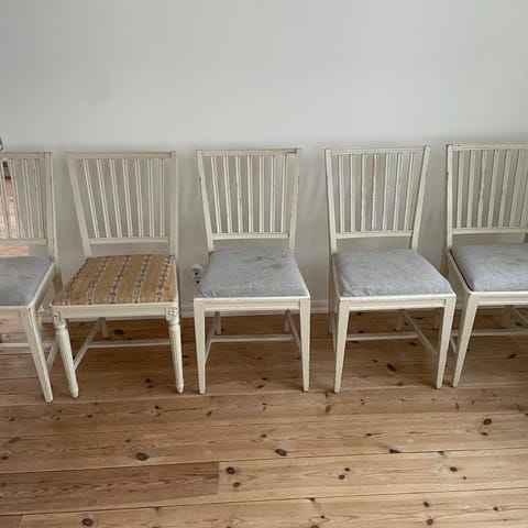 6 matstolar, Leksandsstolen, med sitsar i blårandigt tyg. Stolarna är något slitna men väldigt lite använda då de under många år stått i en gillestuga. Någon fläck på tyget här och där, lite skavt på träet här och där. Därav det lägre priset.