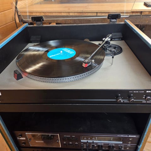 Ganska lite använd, Receiver DA GX 470, Dubbel cassetdeck RS TR 575, Disc player SL OG 580A, LP player Quartz SL QD33, Pro inglasat rack 2 st bord s högtalare Qnigue 2500, manualer handböcker,