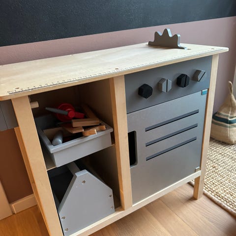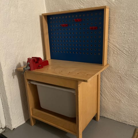 Skänker nu sonens snickarbänk från Melissa & Doug så han har vuxit ifrån den. Stabil bänk med skruvstycke för lekfullt skapande.