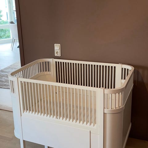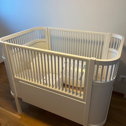 Mycket fin spjälsäng i trä från Sebra inköpt 2020. Sängen kan vara i 3 olika lägen allt eftersom barnet växer. Madrass för "juniorläge" ingår (har aldrig använts). Flera små skavmärken finns och på ena sidan har skivan hoppat ur fästet lite, se bilder. Annars är sängen i fint skick. Sängen hämtas upp nedmonterad.