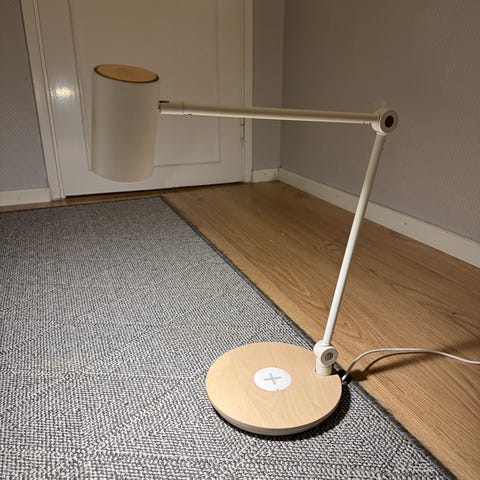 Säljer en smart IKEA RIGGAD arbets-/skrivbordslampa i vitt med fot i bambu. Lampan har inbyggd trådlös Qi-laddning i basen för att kunna ladda mobilen.