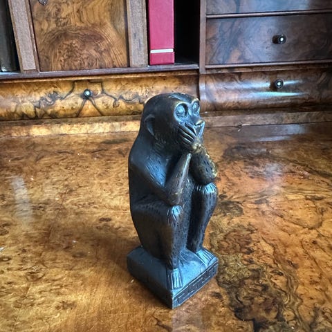 Antik stenfigur föreställande en apa som täcker öronen, svart. Troligtvis handgjort i Vietnam i tidigare 1900-talet. Skulpturen är mkt detaljerad och kan användas som dekorativt föremål i hem eller kontor.