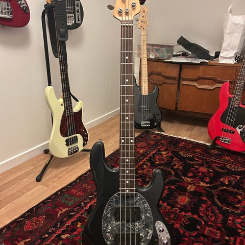 Musicman Stingray, silver sparkling, matching headstock. Spelar otroligt bra, den är i fantastiskt skick.