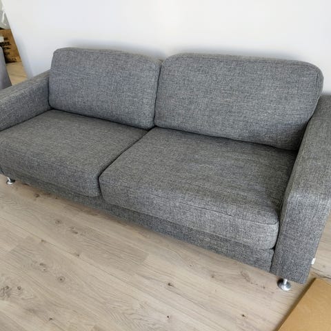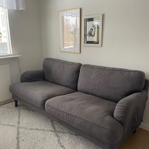 Ikea stocksund gråbeige färg som påminner om oblekt linne. Svarta träben.