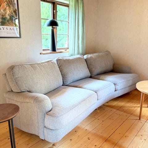 Skagen 3-sits Howardsoffa från soffadirekt. Oklar ålder. Sittbredd 165cm, sittdjup 57cm, sitthöjd 49cm. Färg: beige, ben: trä, svart och metall. Tyg: Polyester, avtagbar på sitt- och ryggpylomer - kan tvättas.
