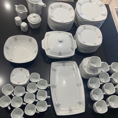 Porslinsservis med blåvita mönster. Servisen består av flera delar inklusive tallrikar, skålar, tekanna, sockerskål och gräddkanna. Tillverkad i porslin med klassiskt blått dekormönster på vit botten. Passar för servering och dukning.