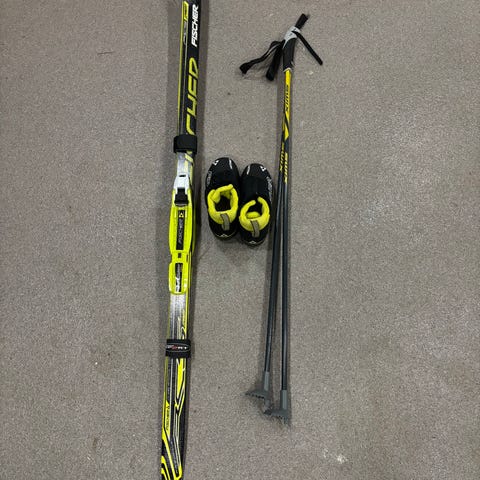 Set med skidor, pläxor och stavar. Mycket bra skick.