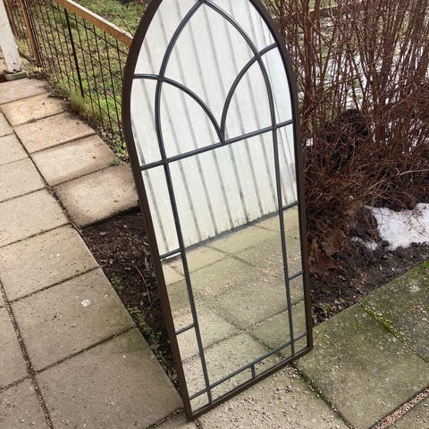 Smidesinfattad spegel som hängs upp i den lilla öglan. För måttade bild.