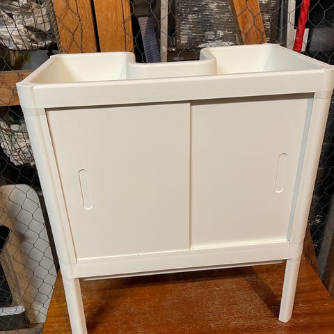 badrumskommod i vitt med integrerad vask och en matchande spegel. Kommoden är B600x H700xD460.
