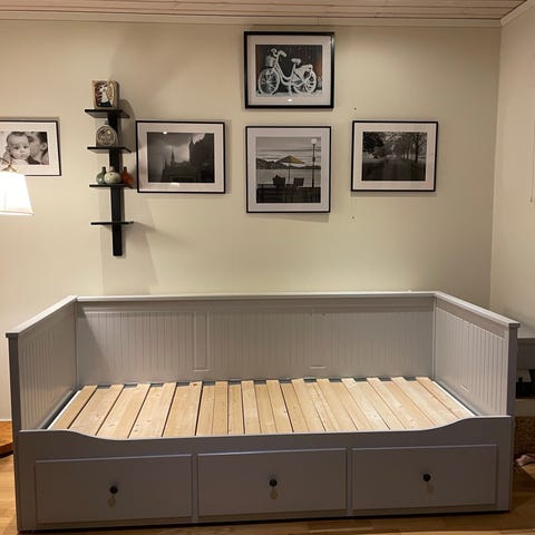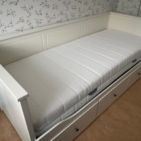 Soffa i vitt trä med tre lådor för förvaring under sitsen. Soffan har en ryggstödspanel med spårdetaljer. Hemnes skavd på några ställen vilket enkelt målas alternativ att dölja med kuddar.