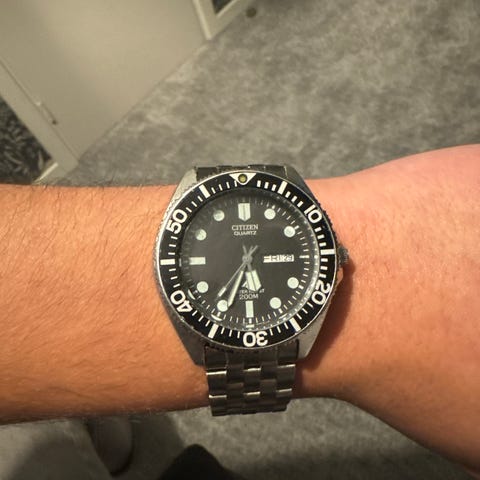 Klassisk herrklocka med svart urtavla, boett och länk i rostfritt stål. Boettens storlek är cirka 41 mm i diameter. Mycket skön klocka att bära. Fint skick.