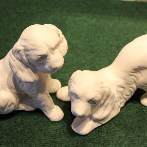 figurer i keramik föreställande en katt och en häst. Båda figurerna är vita med dekorativa blommotiv i lila och grönt. Hästen har blå man och svans. Figurerna är dekorativa och kan användas som prydnadsföremål.