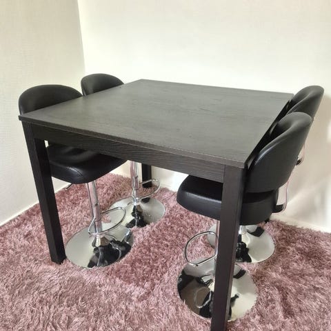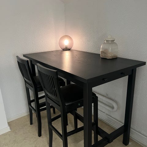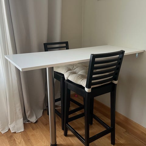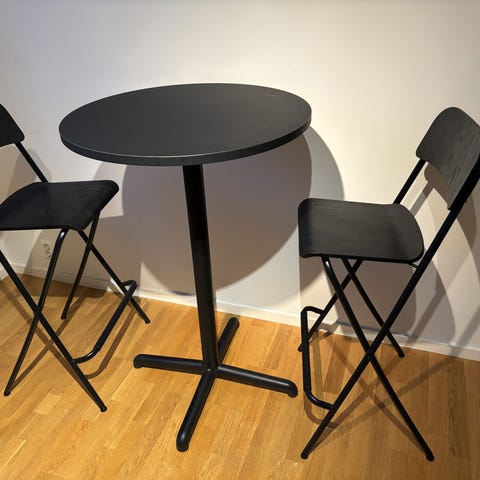 Barbord med två matchande barstolar i svart trä. Enkel och funktionell design med en yta som är lätt att rengöra. Passar för det mindre, utrymmeseffektiva köket.