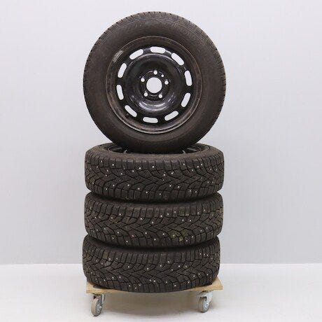 Bild 2.Till vänster 4st 195-65-15 dubbade Pirelli från 2020 8-9mm passande Renault Kangoo 5-bult pris 3000kr,till höger 4st 205-60-16 dubbade Kumho från 2019,7-8mm kvar,passar Ford Connect (den lilla skåpbil) 2013-2023,pris 3000kr