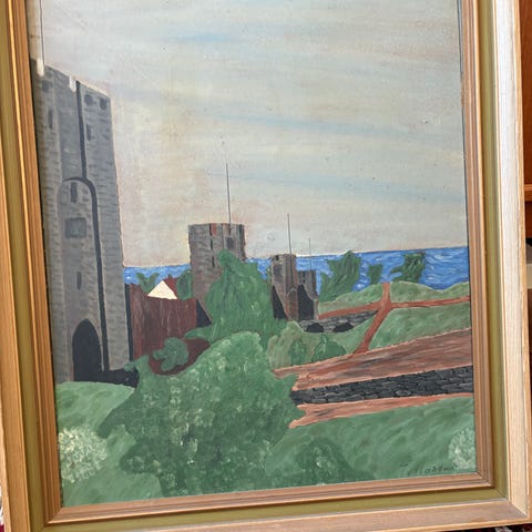 Oljemålning föreställande ett stadsmotiv med byggnader och en kyrkspira. Konstverket visar detaljerade arkitektoniska element och är utfört i en realistisk stil.