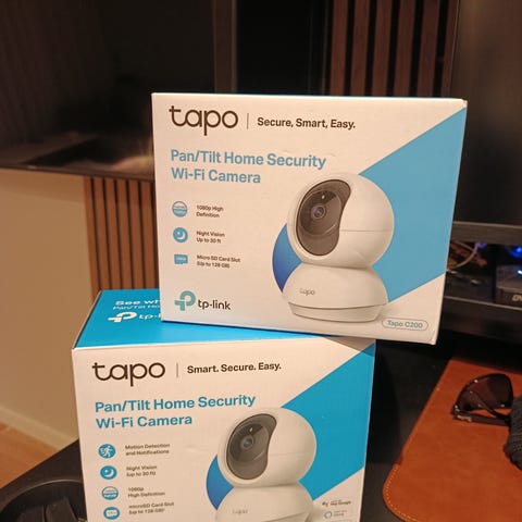 Tapo 2K övervakningskamera i vit färg. Kameran erbjuder 2K-upplösning för detaljerad bildkvalitet och är avsedd för säkerhetsövervakning. Man kan ha app till dom.