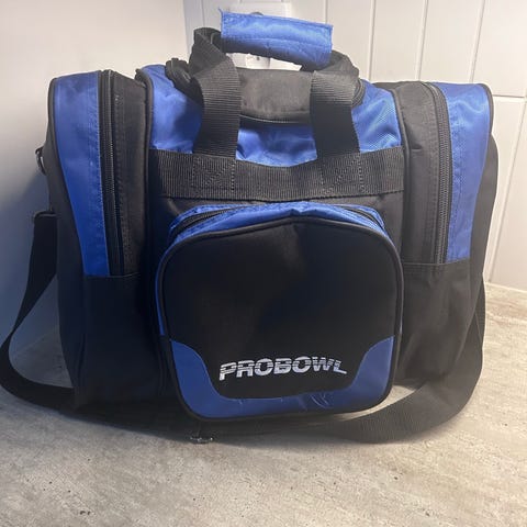 En Brunswick bowlingväska med plats för två bowlingklot. Väskan är blå med svart och har flera fack för förvaring. Passar för transport och förvaring av bowlingutrustning.