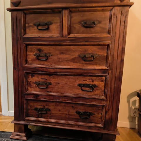 Byrå i trä med tre lådor. Möbeln har en yta som kan användas för förvaring eller dekoration. Passar för olika rum som sovrum eller vardagsrum. Säljer pga platsbrist! Köpt second hand!