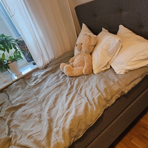 Mio sängmadrass med ljus färg och vadderad yta. Passar för användning som bäddmadrass för ökad komfort och skydd av underliggande madrass.