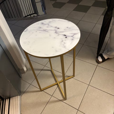 Fint bord att ha lampa eller växt på. Återvunnet trä med marmorskiva.