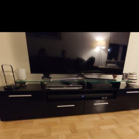 Glasskiva ovan, 3 luckor, i mitten finns det en glashylla medans den andra två sidorna finne en vanlig vit hylla.