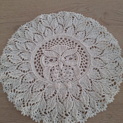 Handvirkad uggla av garn, 31-33 cm i diameter. Tillverkad av 100% bomull.