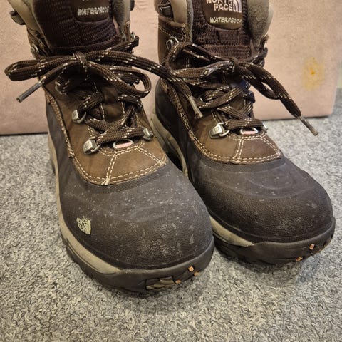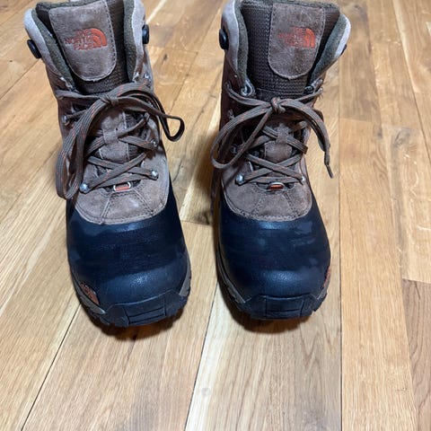 The North Face vinterskor i storlek 39, brun färg. Skorna är fodrade med mjukt och varmt material för att ge isolering och komfort vid kalla förhållanden. De har snörning för justerbar passform och en slitstark sula för bra grepp på vinterunderlag.