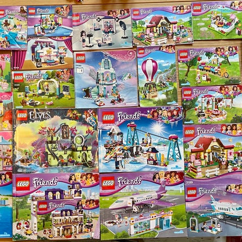 LEGO Friends ca 7kg med olika byggsatser. Vissa är fortfarande i påsar. Innehåller mer lego än de på bilderna med dessa vet jag med säkerhet finns med. Innehåller även plattor och gubbar med tillbehör. Nypris är uppskattningsvis över 6000kr